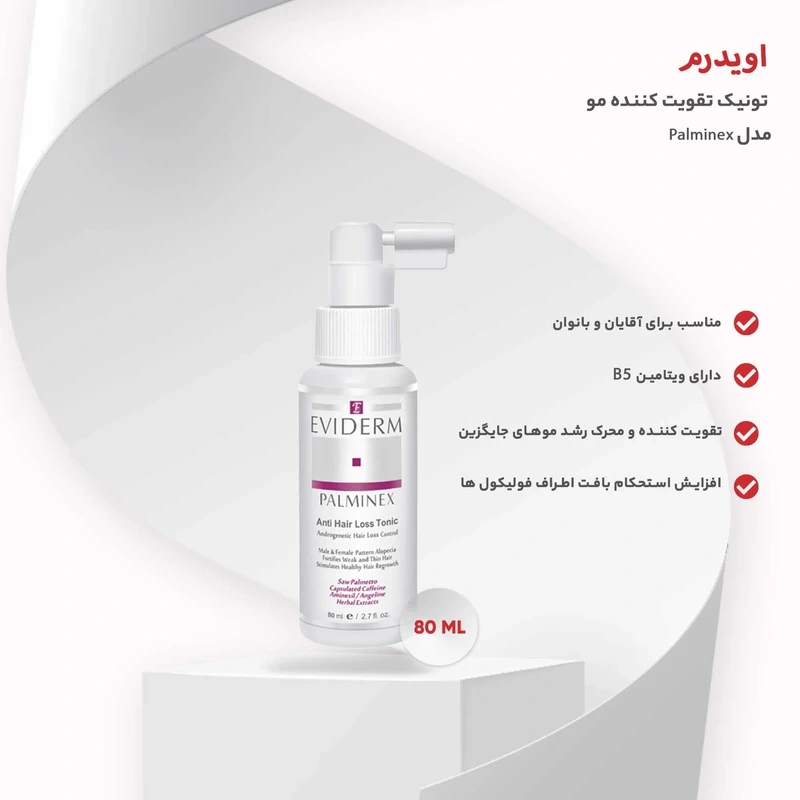 تونیک ضد ریزش مو پالمینکس اویدرم (Eviderm Palminex Hair Tonic) یکی از محصولات تخصصی برند ایرانی اویدرم است که با ترکیبی از مواد ضد ریزش و آنتیآندروژنیک برای درمان ریزش موی ارثی و هورمونی طراحی شده است.